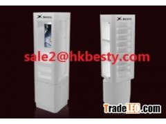 Rotate by hand: 1 side pull out ring holding wires 1 side acrylic slat-wall with ABS hook 1 side 2 display windows with lockable glass door 1 side bracelet display bars 4 side LED lighting: 1 crystal light box input:110~240Vac, power 50W
